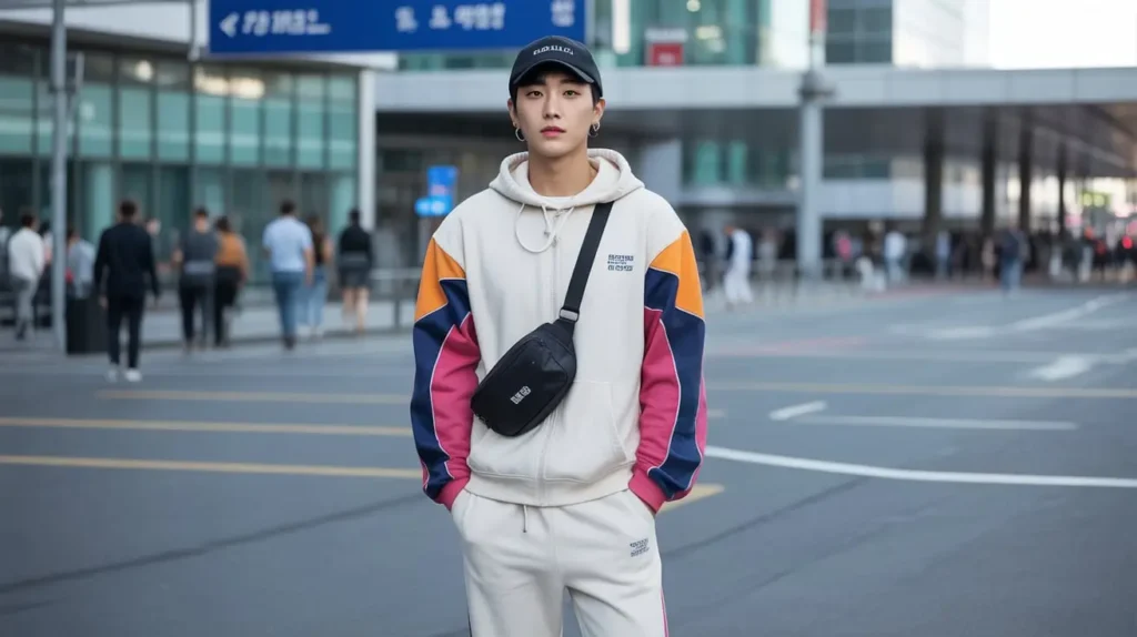 Tracksuits, hoodies, and sporty sneakers reflect K-pop’s casual, comfortable airport or rehearsal looks. Bright colors, logos, or color-blocking make the outfit visually appealing, while accessories like caps or crossbody bags complete the ensemble.