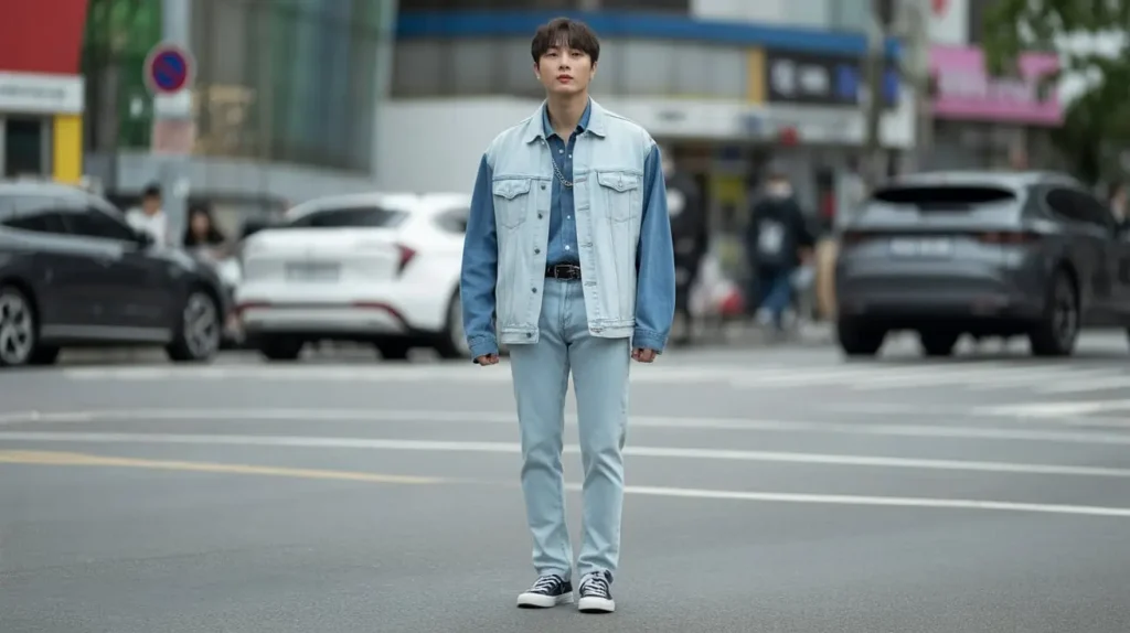 Why it works: Layering denim showcases texture and depth, key in K-pop streetwear styling.