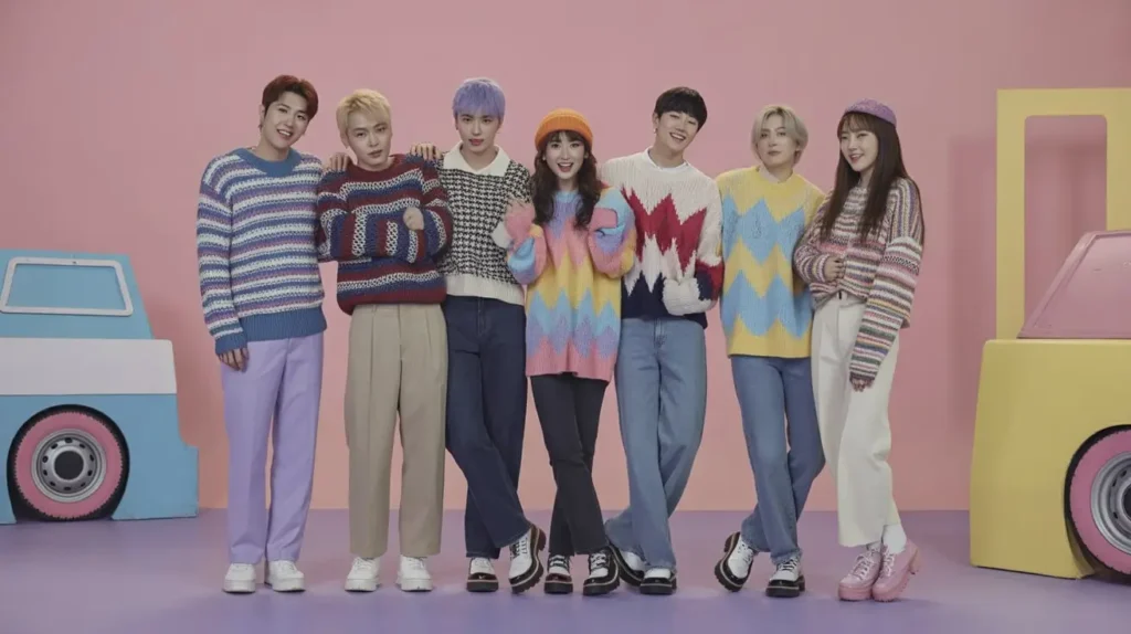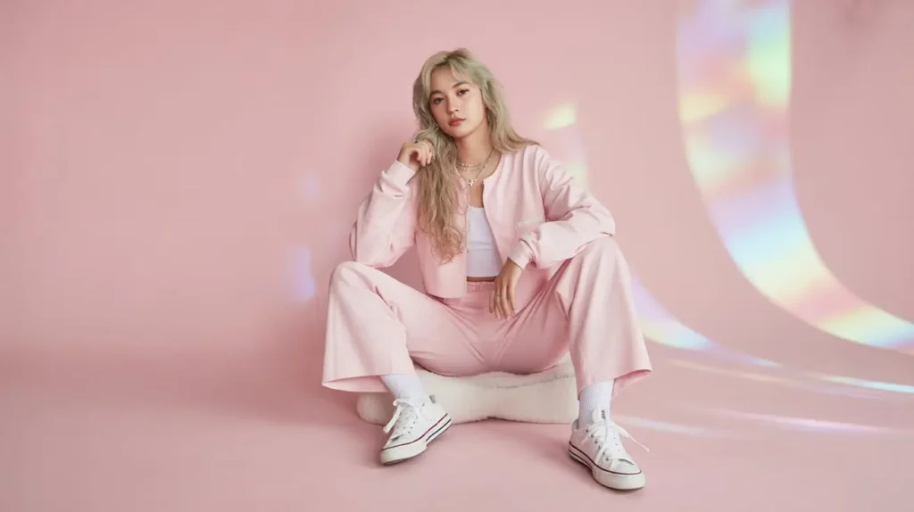 Why it works: Coordinated pastels create cohesive, soft visuals central to K-pop charm.
