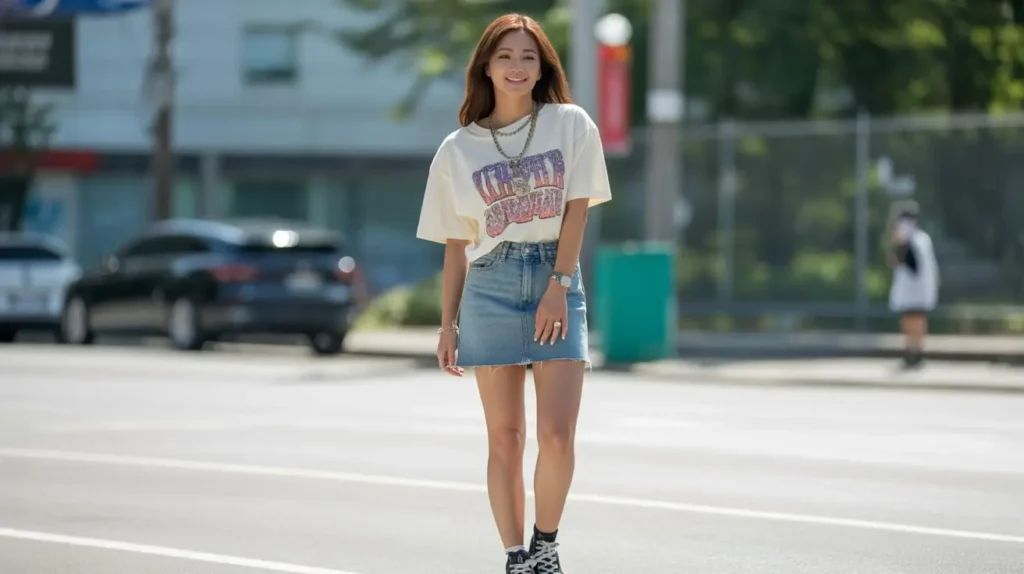 A casual K-pop favorite, denim skirts paired with oversized graphic tees create a relaxed yet trendy look. Sneakers, platform shoes, or boots complete the style, and playful accessories like layered necklaces or hats enhance personality. Perfect for casual outings or music video scenes.