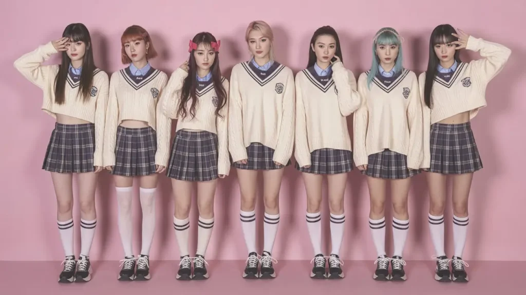 Plaid skirts paired with oversized sweaters, crop tops, or blazers create the quintessential K-pop schoolgirl aesthetic. Knee-high socks or chunky sneakers add balance, and playful accessories like ribbons or hair clips enhance charm. Ideal for fan events or music videos.