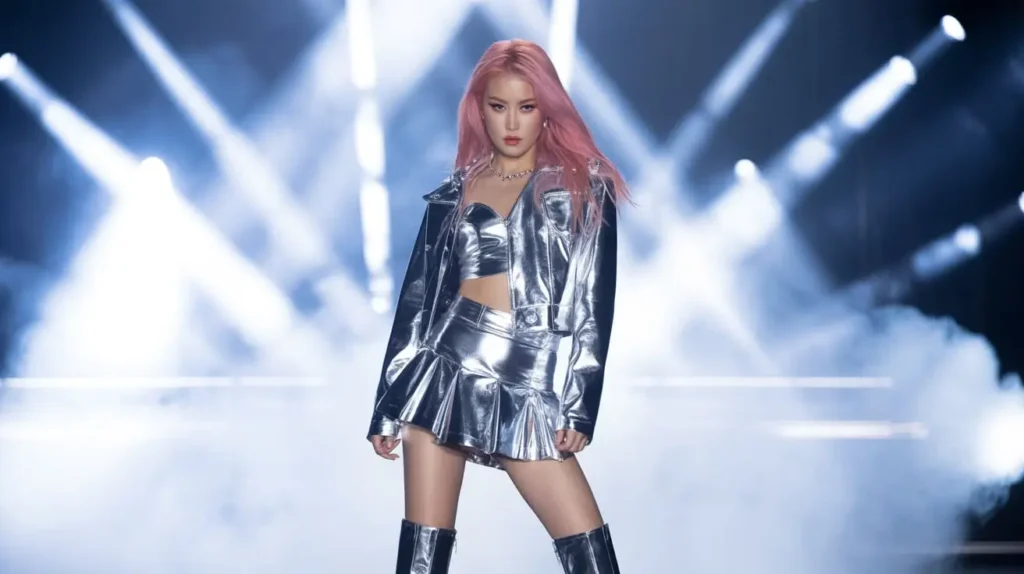 Metallic jackets, skirts, or pants create futuristic stage outfits. Pair with minimal tops, statement boots, and bold makeup for maximum visual impact. This style is common in K-pop performances where dramatic aesthetics are key.
