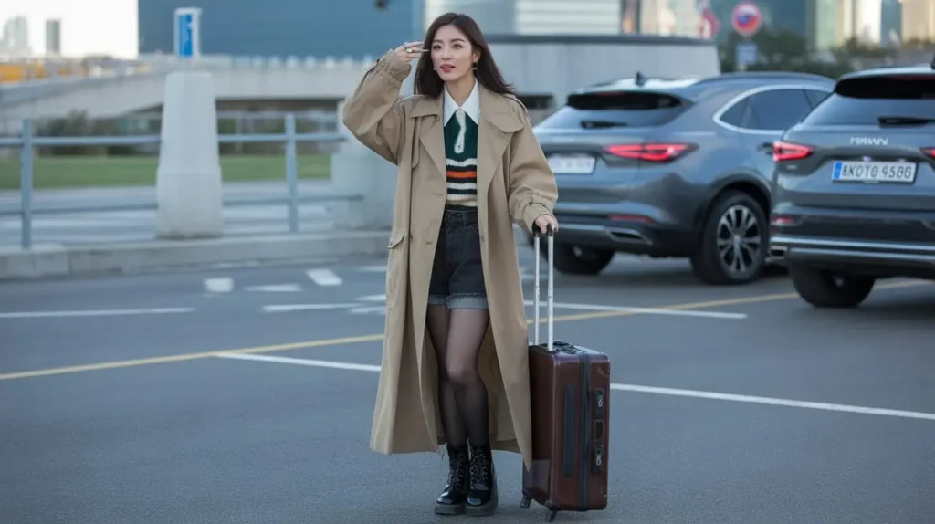 Long coats or trench jackets over shorts and tights combine practicality and style. K-pop idols often layer textures and colors for dynamic airport or casual looks. Chunky boots or sneakers complete the edgy aesthetic.