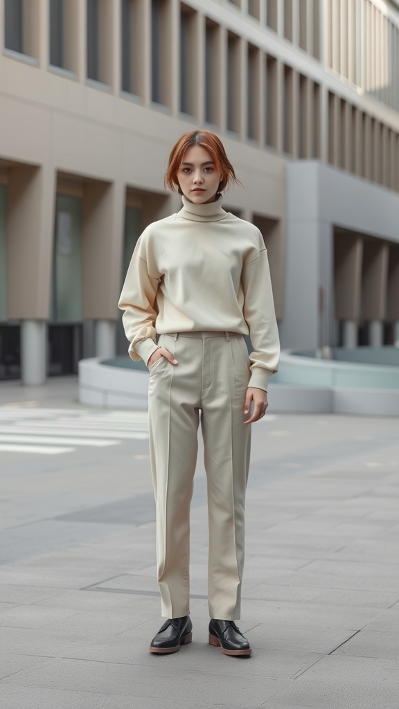 Monochrome outfits are all about simplicity and style. In this image, we see a chic outfit that embodies this trend perfectly. The model wears a soft beige turtleneck paired with tailored trousers in the same shade. This creates a sleek and put-together look that feels comfortable yet sophisticated.