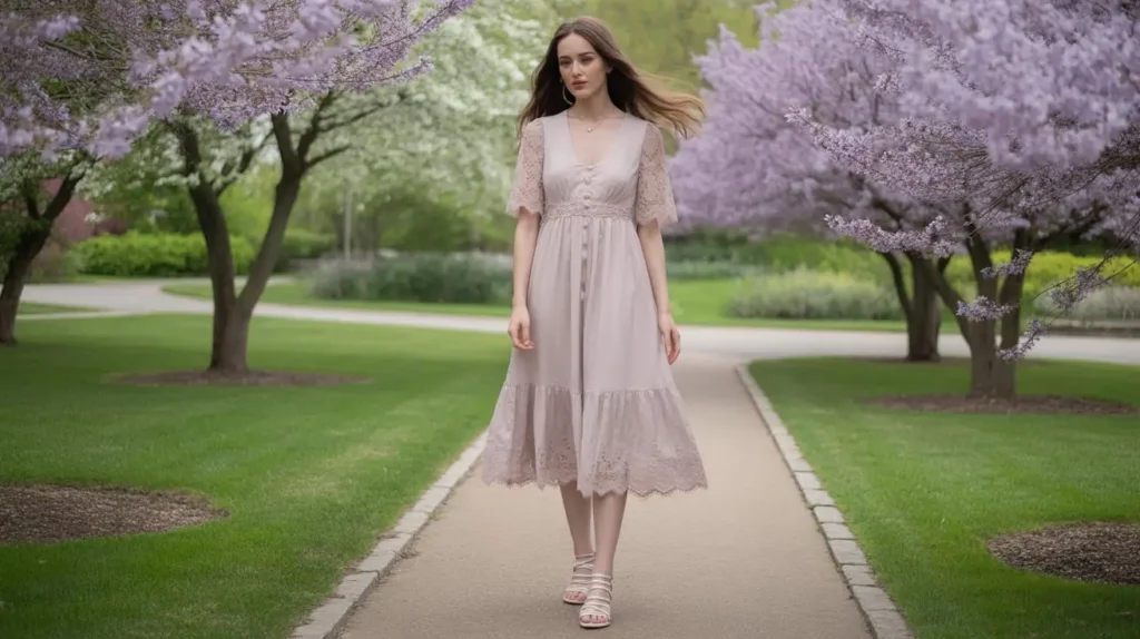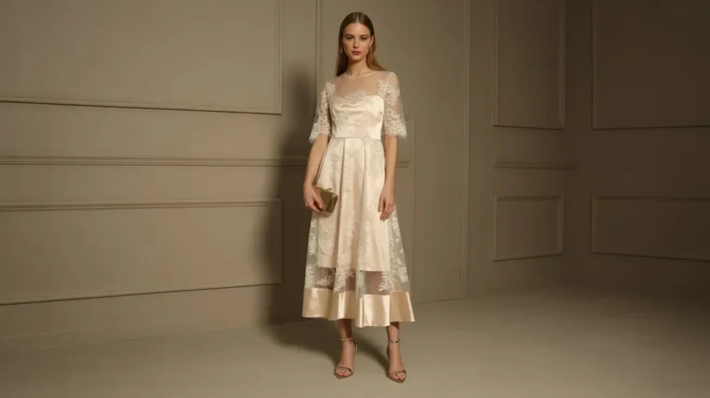 Inspired by the 1950s and 1960s, tea-length lace dresses with cinched waists give a polished retro charm that works perfectly for daytime gatherings. Soft pastels or ivory shades paired with kitten heels and pearl jewelry enhance the nostalgic aesthetic. The delicate lace combined with modest length provides a balance of elegance and demure sophistication, perfect for classic garden or tea parties.