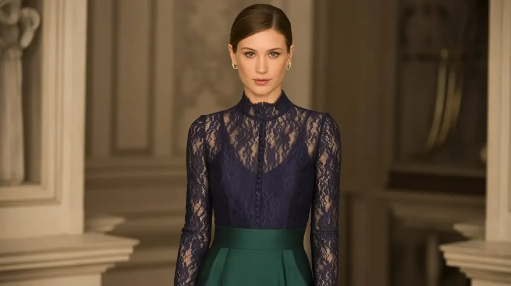 A high-neck lace dress offers regal refinement, especially in deeper shades like navy, emerald, or burgundy. Long sleeves, fitted waistlines, and subtle lace patterns enhance elegance while keeping the overall look refined. Pairing with pointed heels, minimal jewelry, and a sleek hairstyle makes it perfect for formal dinners, gala events, or evening receptions where a polished appearance is essential.