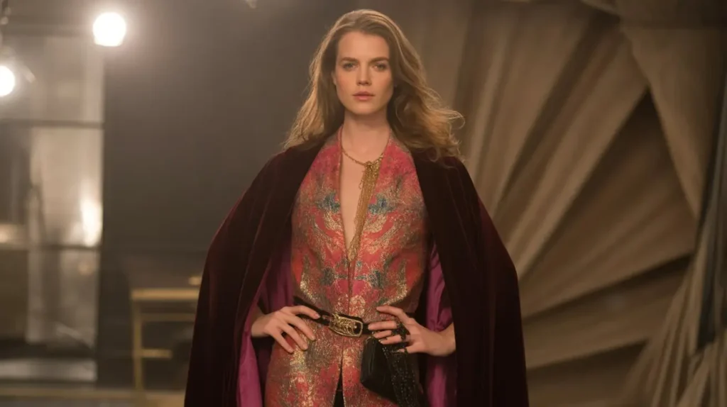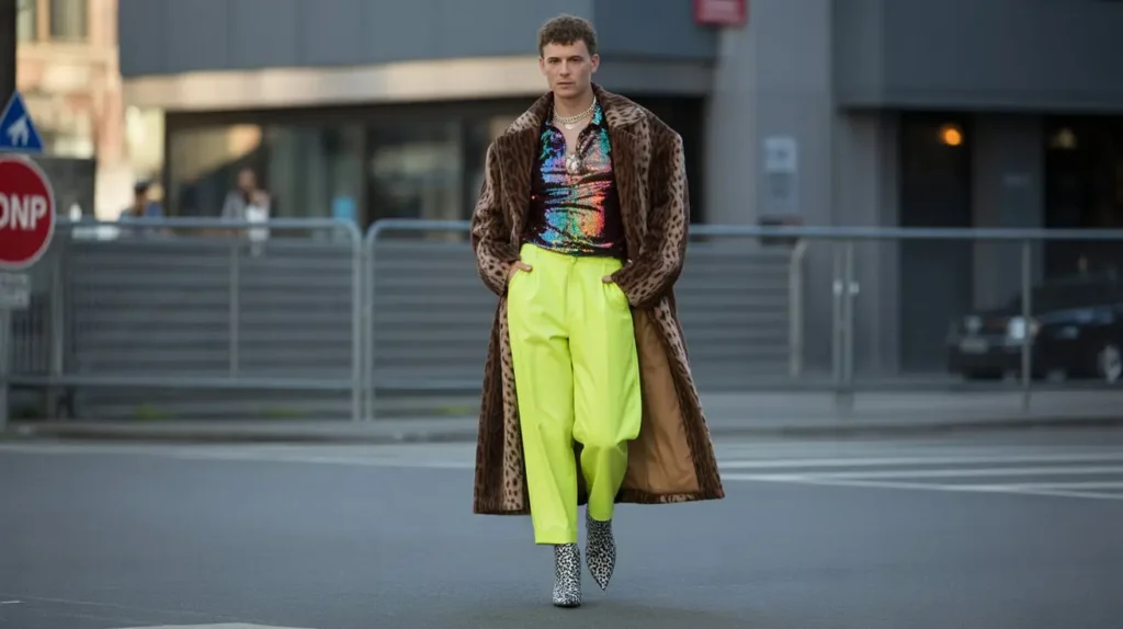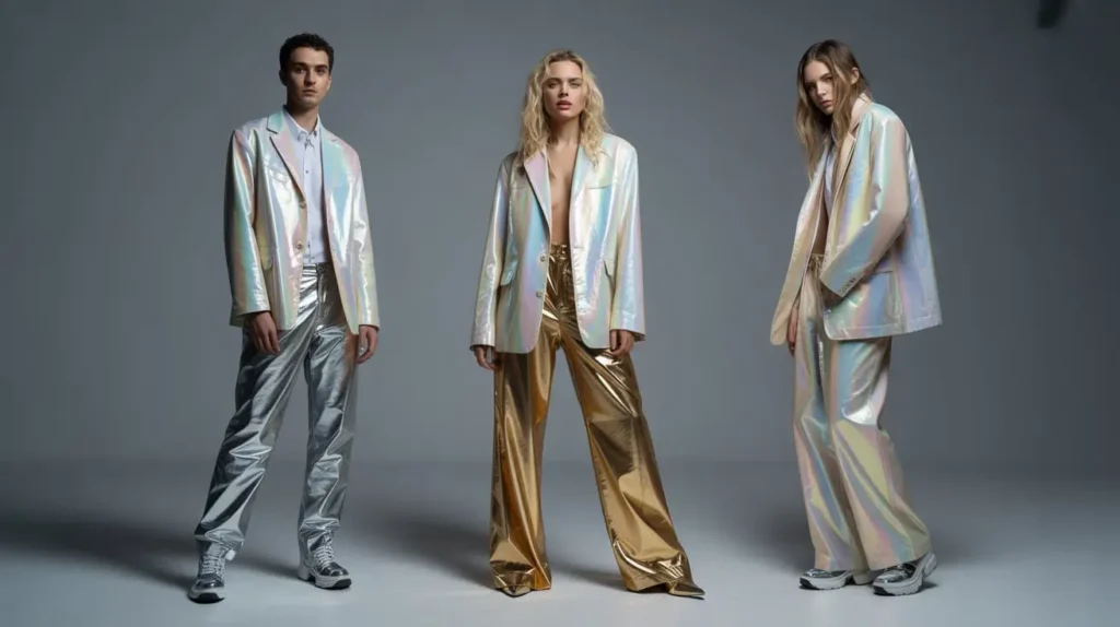 Shiny fabrics in gold, silver, or iridescent hues amplify the drama. Metallic trousers, jackets, and accessories give futuristic maximalist energy.