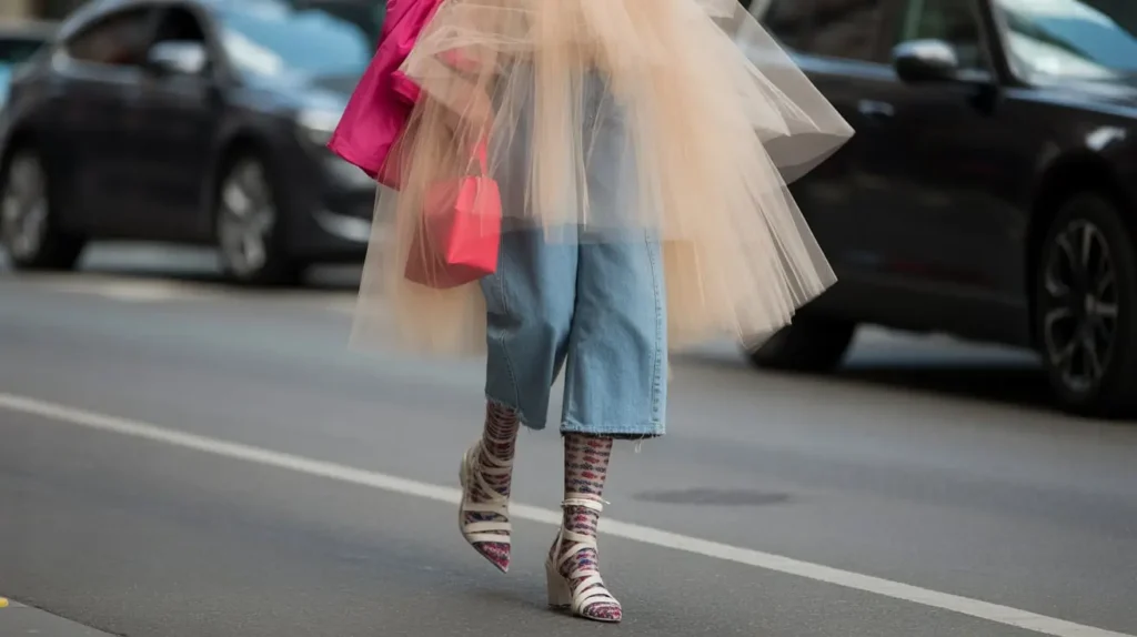 Wearing skirts over trousers, with patterned tights underneath, creates intentional abundance. Mixing fabrics like tulle, denim, and silk builds maximalist energy.