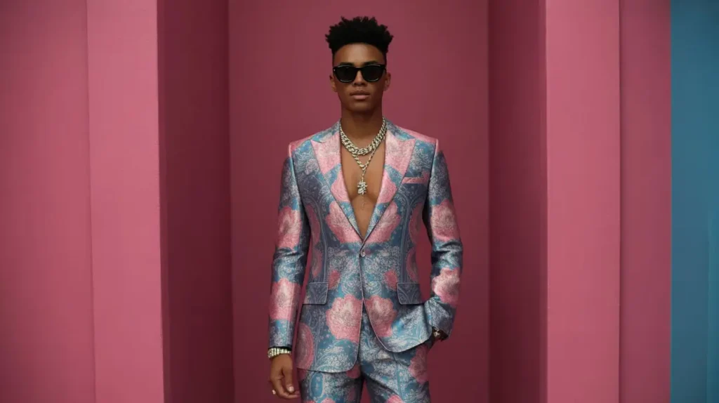 A full suit in floral, paisley, or baroque patterns embodies fearless maximalism. Worn with equally strong accessories, it dominates any room.