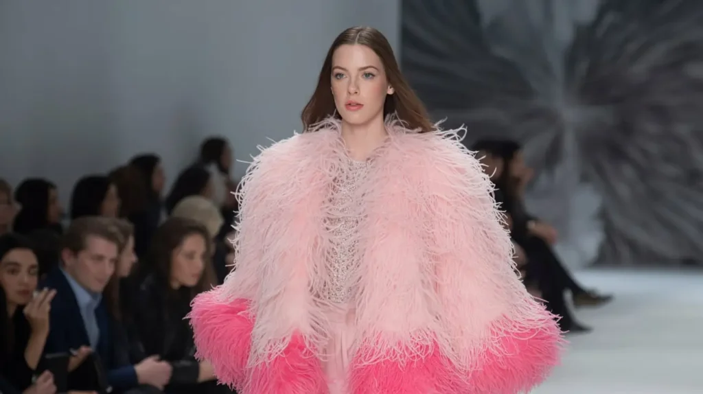 Feathers add volume and whimsy to jackets, trousers, or accessories. Bright feather trims on sleeves or full feather coats make outfits theatrical.