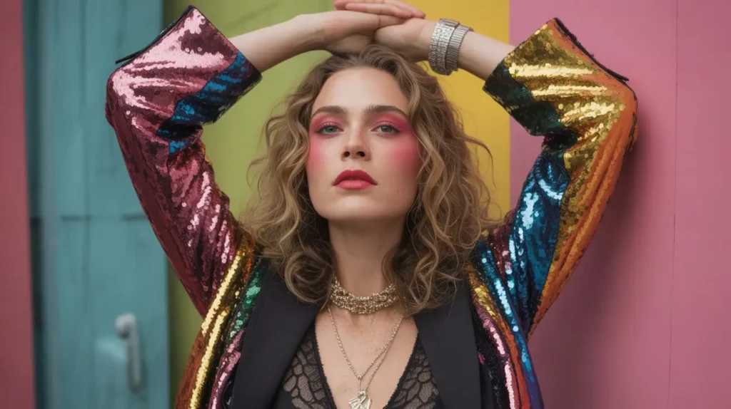Combining 70s flared pants, 80s sequins, and 90s grunge in one look creates retro maximalist flair. Add loud makeup or bold eyewear to complete the effect.