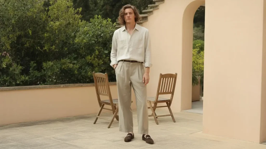 Both men and women can wear a linen shirt paired with wide-leg trousers for a chic, relaxed Old Money outfit. Loafers or minimalist sandals complete the look for warm-weather elegance.