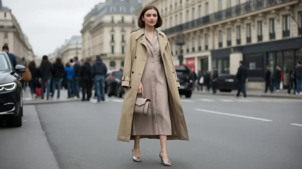 Why it works: Trench coats symbolize elegance, while midi dresses maintain timeless femininity, creating a balanced Old Money ensemble.