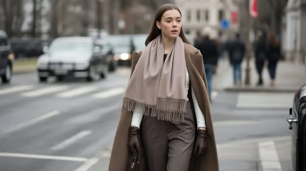 Why it works: Wrap coats offer structure and warmth, while cashmere scarves add luxurious texture, completing the classic Old Money style.