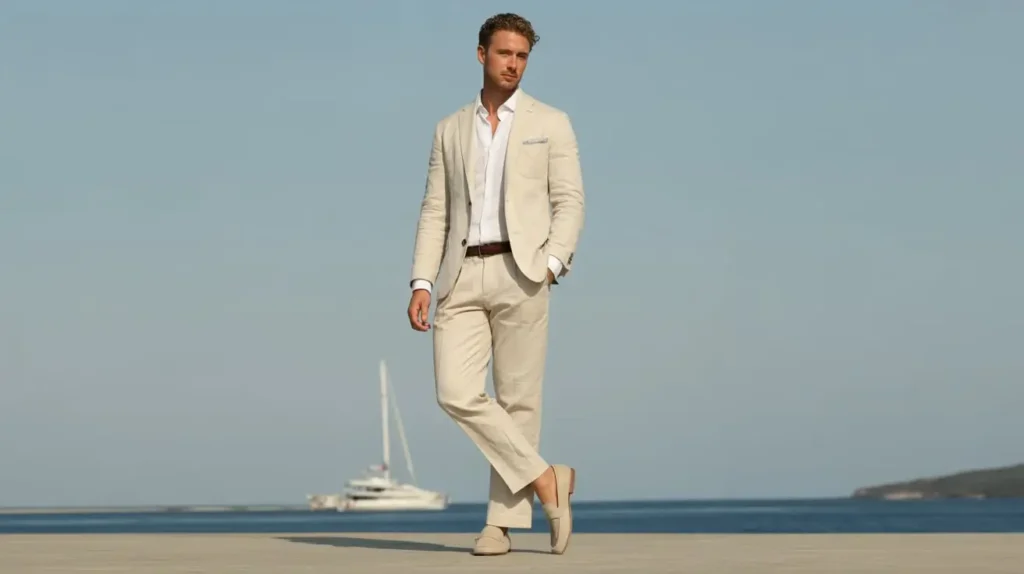 Men can wear a lightweight linen suit with a crisp shirt for warm-weather sophistication. Loafers and a minimalist watch keep the outfit polished, making it ideal for social events or casual meetings.