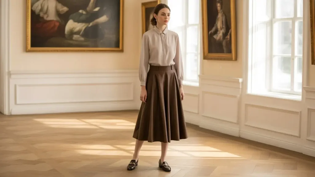 Women can combine an A-line skirt with a tailored blouse for a clean, classic Old Money daytime outfit. Pairing with loafers or low heels enhances elegance without looking overdone.