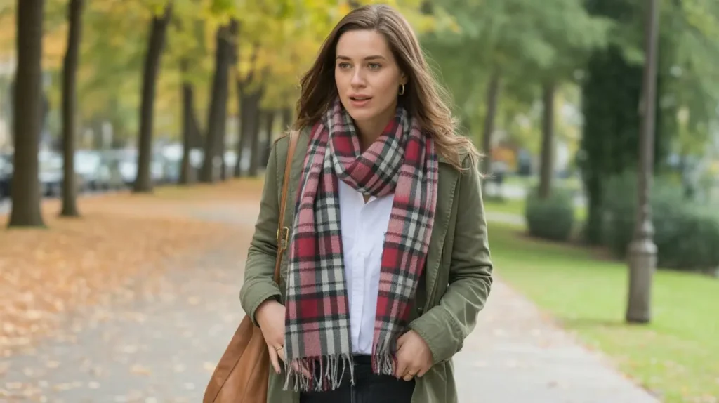 I love using a scarf with rich, autumnal colors—think burnt orange, deep burgundy, and forest green—to complement the classic neutrals of fall outerwear.