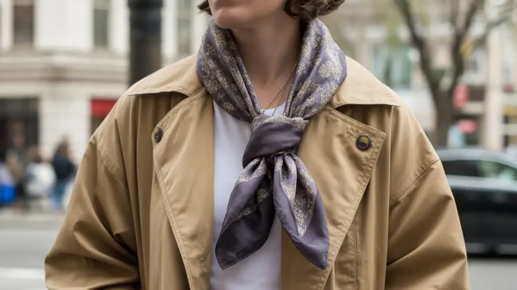 - On the Epaulet: Tie a small silk scarf in a neat knot around the buttoned epaulet (shoulder strap) of a trench coat or utility jacket.
