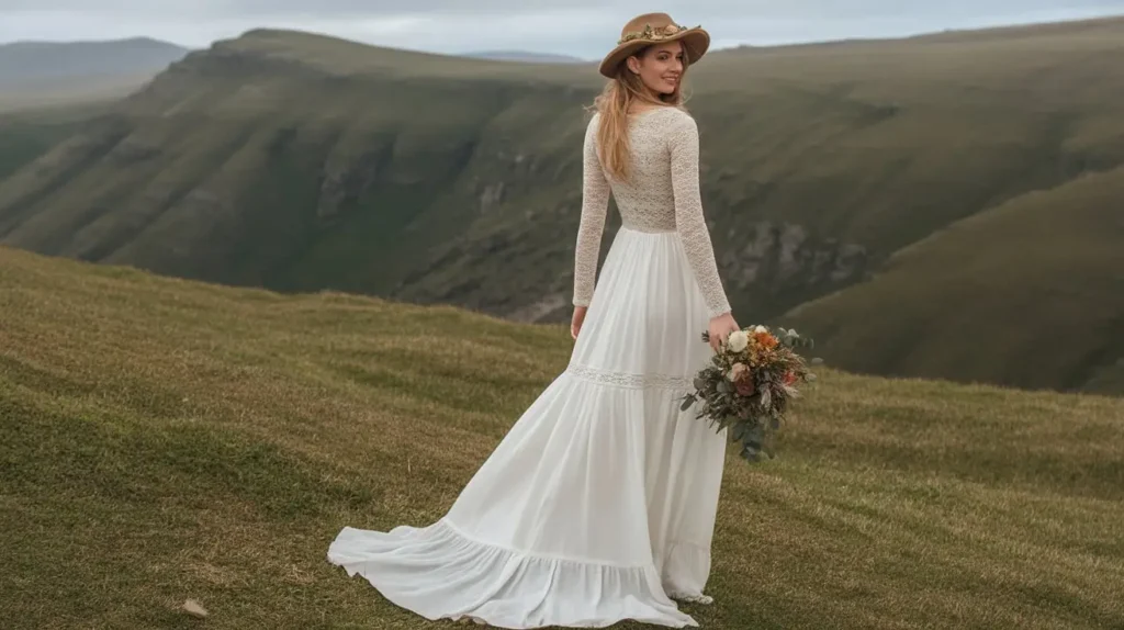 Instead of a structured gown, picture a relaxed, flowing silhouette made from a lightweight silk like crepe de chine or silk georgette. These fabrics move beautifully in the wind, making them perfect for an outdoor, woodland, or beach wedding. The look is less about structure and more about ease, movement, and a touch of ethereal romance.