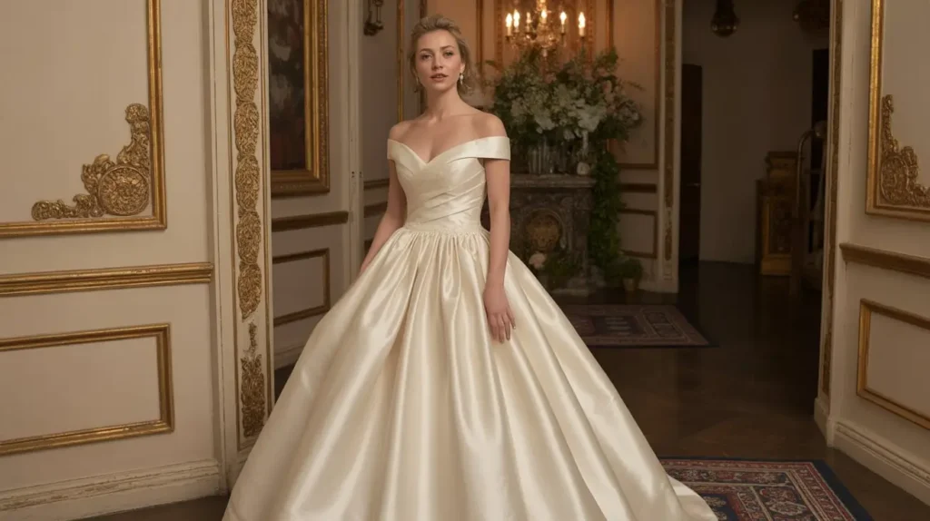 A silk off-shoulder gown can range from a sleek, fitted sheath to a dramatic A-line. The star of the show is the neckline, which draws the eye upward and highlights your face. I personally love how this style feels both regal and a little bit sexy. It’s confident, graceful, and utterly sophisticated.