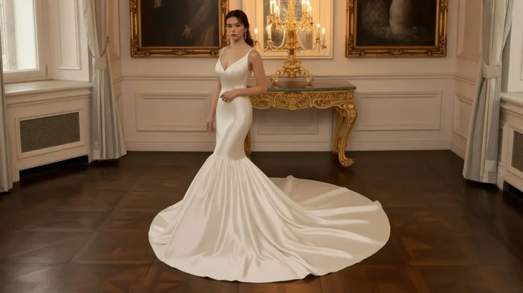 If you’re here for the drama, then allow me to introduce the silk mermaid gown. This silhouette is all about celebrating your curves. It fits snugly through the bodice and hips before flaring out dramatically around the knees. It’s a bold, glamorous, and unapologetically sexy choice.