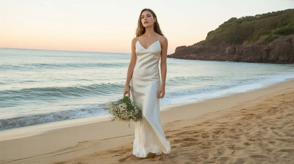 On the complete opposite end of the spectrum, we have the silk slip dress. This is for the effortlessly cool bride who values chic simplicity over everything else. It whispers elegance instead of shouting it. Popularized in the ’90s, the slip dress has made a massive comeback, and frankly, I’m so here for it.