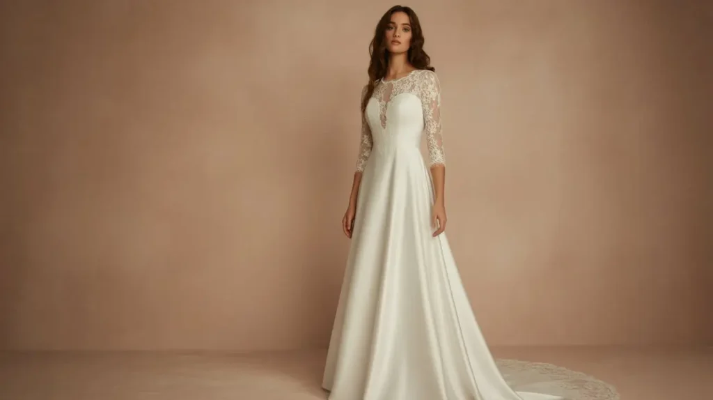 Now, imagine that classic silhouette crafted from a lustrous silk, with delicate lace appliqués thoughtfully placed along the hem, bodice, or sleeves. The silk provides a clean, radiant backdrop that makes the intricate lace details pop. It’s the perfect compromise for the bride who loves the romance of lace but wants the modern, luxurious feel of silk.