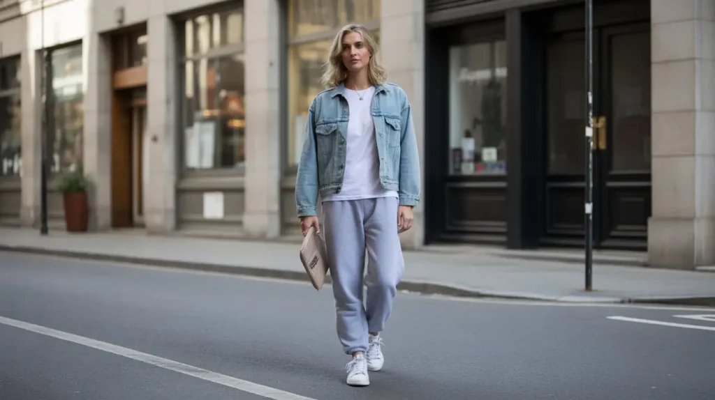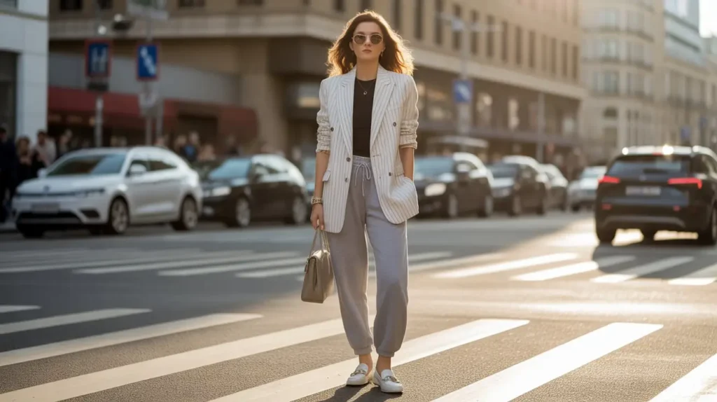 Okay, this is the power move. The ultimate high-low flex. Pairing sweatpants with a structured blazer is the fashion equivalent of saying “I contain multitudes.” It’s business-casual’s cool younger sibling who doesn’t play by the rules.