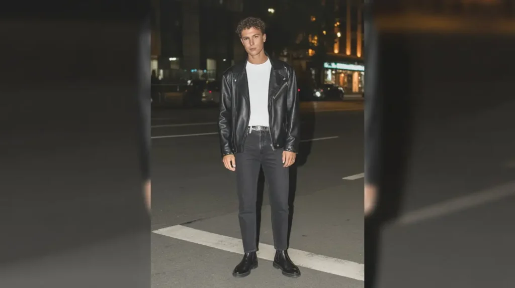 Pair a fitted or slightly boxy leather jacket with a neutral tee and straight black jeans; add Chelsea boots or high-top sneakers.