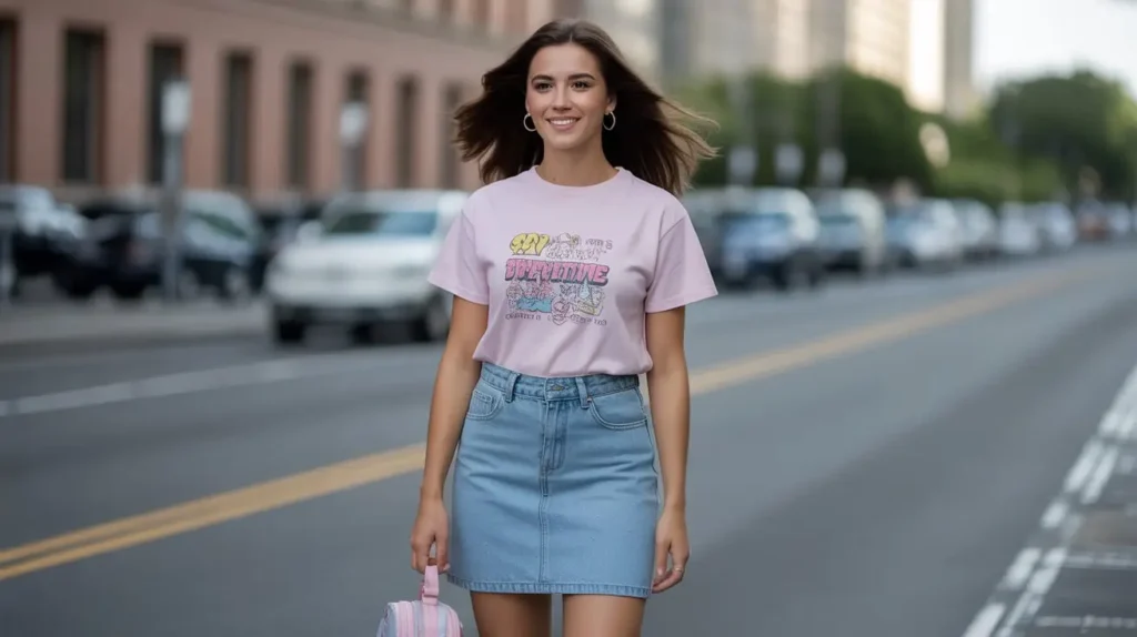 The baby tee became a playful fashion statement, cropped just above the waist and often featuring fun graphics or pastel shades. Paired with a denim or corduroy mini skirt, it created a youthful, easygoing outfit. Finished with platform sandals or sneakers and a mini backpack, it perfectly captured 90s everyday style.