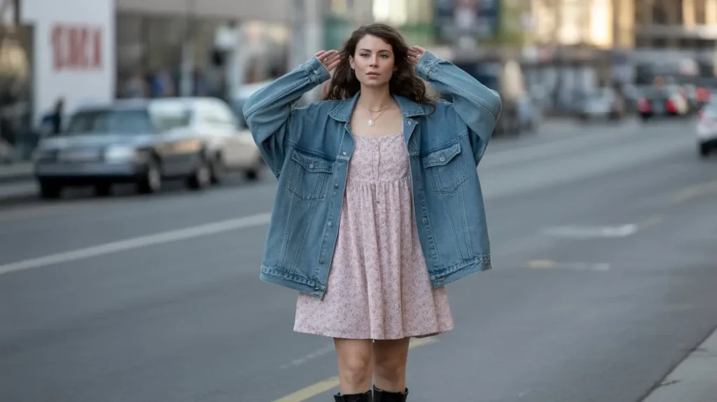 A floral babydoll dress layered with an oversized denim jacket captured the perfect mix of grunge and femininity. The jacket added structure, while the dress kept the look playful and sweet. Combat boots or sneakers grounded the outfit, giving it edge and practicality that defined everyday 90s style.