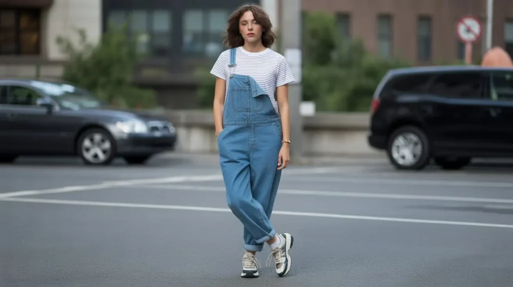 Overalls were a 90s essential, worn casually with a crop top underneath for a playful, relaxed vibe. Often styled in light or distressed denim, they were paired with sneakers or platforms for a youthful look. Wearing one strap undone was a popular twist, making the outfit even more fun and laid-back.