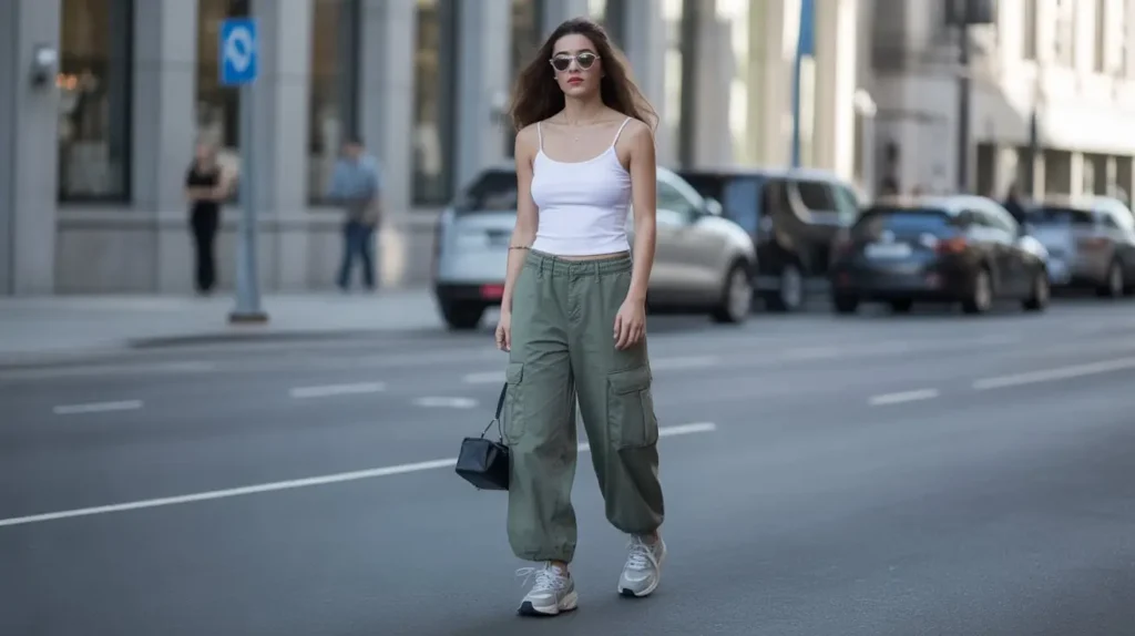 Spaghetti strap tops were a must-have in the 90s, often paired with cargo pants for a mix of feminine and utilitarian. The fitted top balanced the looser pants, creating a trendy silhouette. Styled with chunky sneakers or boots and small accessories, it was a go-to look for casual hangouts.
