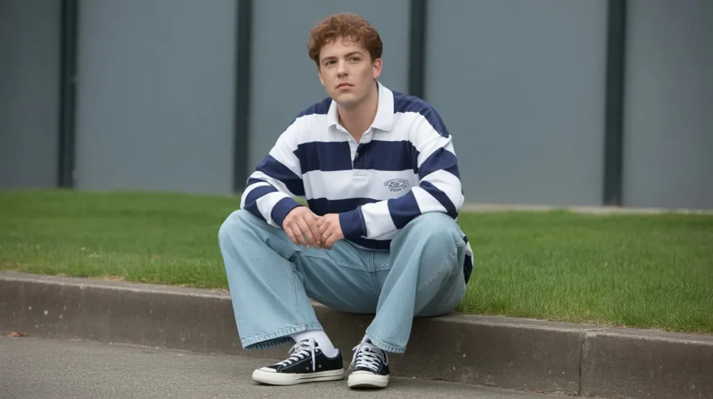 13. Striped Rugby Shirt with Baggy Jeans