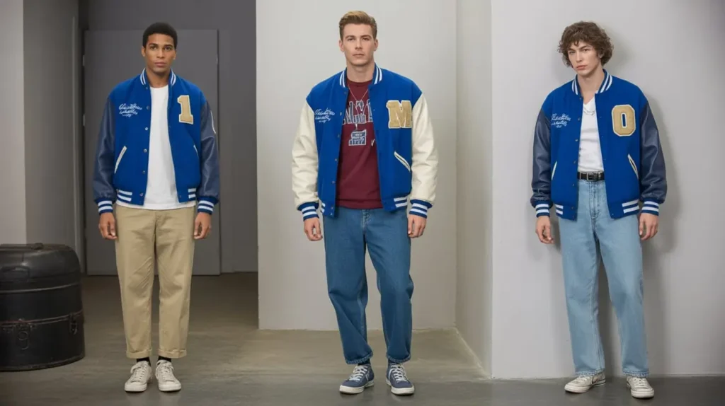 Varsity jackets bring sporty vintage energy, often styled with chinos or denim. Men and women wore them alike in the 80s and 90s, combining casual comfort with cool collegiate vibes. Paired with sneakers, the look remains youthful and fresh.