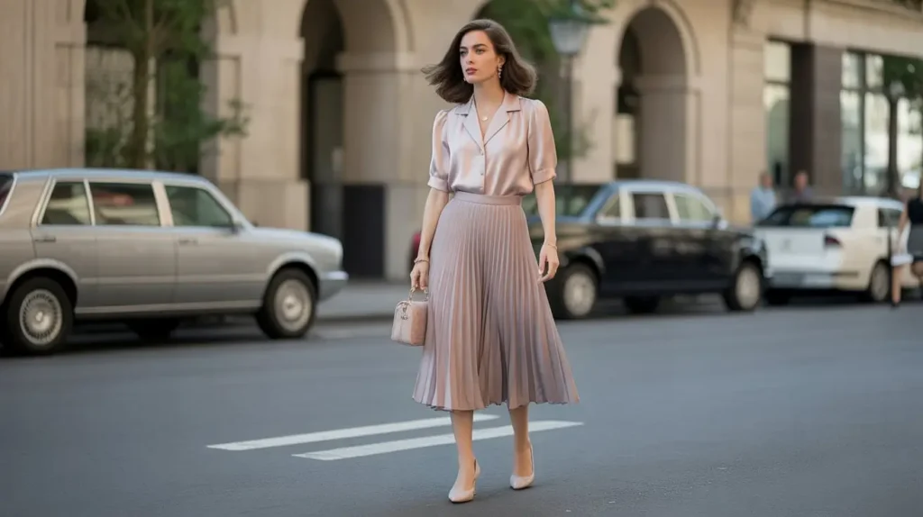 For women, pleated skirts worn with tucked-in blouses highlight an elegant vintage aesthetic. Soft pastels or neutral tones make it classy, while kitten heels or loafers keep it versatile. A structured handbag enhances the timeless feel.