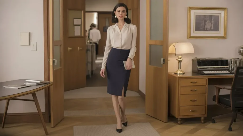 The pencil skirt offered timeless vintage elegance for women, especially paired with a button-up blouse. Neutral tones made it versatile for office wear or evenings. Pumps and pearl earrings finished the refined look.
