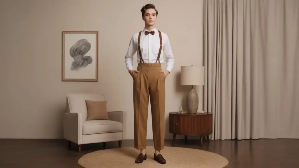 High-waisted trousers paired with a crisp white shirt offer a polished vintage look. For women, this often meant wide-leg trousers and soft blouses, while men leaned toward pleated styles with suspenders or belts. Leather loafers or oxfords complete the outfit with timeless charm.