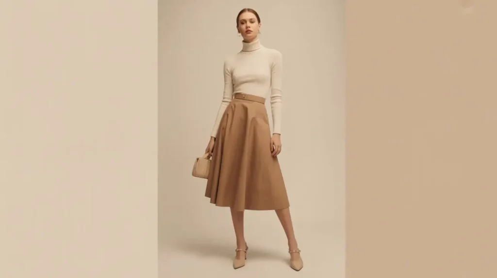 Women’s midi skirts styled with fitted turtlenecks defined understated vintage elegance. Neutral shades like camel, cream, or black kept the look chic. Slingback heels or boots completed the polished outfit.
