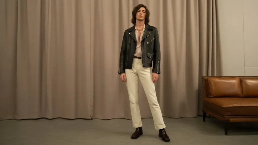 The leather jacket is a vintage staple for men and women alike. Styled with slim trousers or jeans, it gives a rebellious edge that’s both classic and modern. Boots or loafers complete the timeless rocker aesthetic.