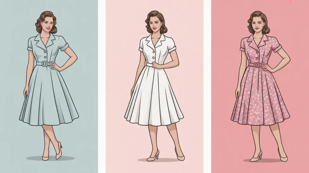 A-line dresses cinched at the waist with slim belts highlight a classy vintage silhouette. Solid colors or subtle patterns make it timeless, and low heels or sandals add polish. This look channels 50s and 60s charm beautifully.