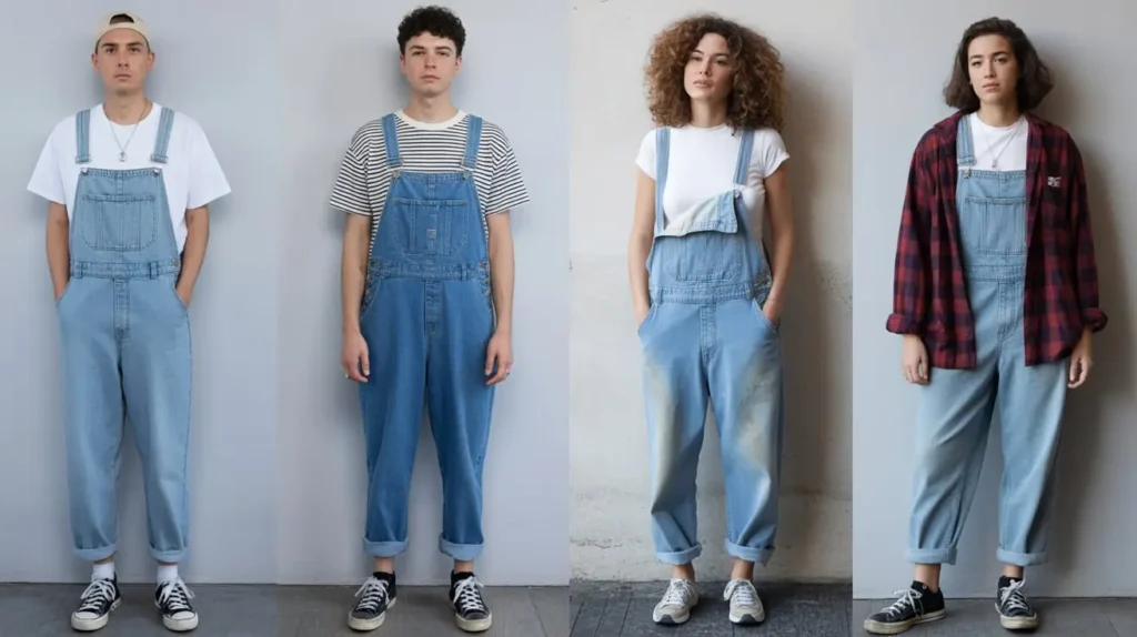 Overalls were a relaxed staple for men and women, often worn with plain tees underneath. Rolled cuffs and sneakers kept the outfit casual, while layering with a flannel shirt added extra vintage charm.