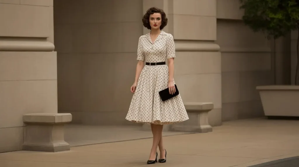 Polka dot dresses carry a playful yet refined vintage aesthetic. Paired with classic pumps and a clutch, the look channels mid-century elegance. A short cardigan or shawl adds an extra layer of charm.