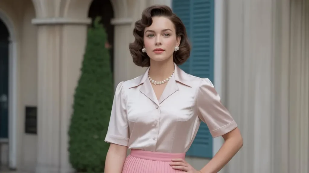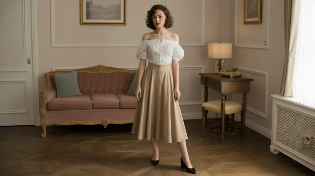 The high-waisted skirt and blouse pairing created one of the most polished vintage silhouettes. Whether pencil-shaped for formality or pleated for ease, the look enhances the waist while keeping balance. Light fabrics and neutral colors make this outfit timeless and versatile.