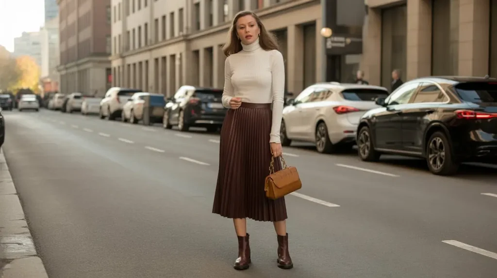 Pleated skirts paired with fitted turtlenecks created a sleek and feminine silhouette. The contrast of texture and shape gave the outfit both depth and balance. With ankle boots or slingback heels, it’s perfect for transitional seasons.