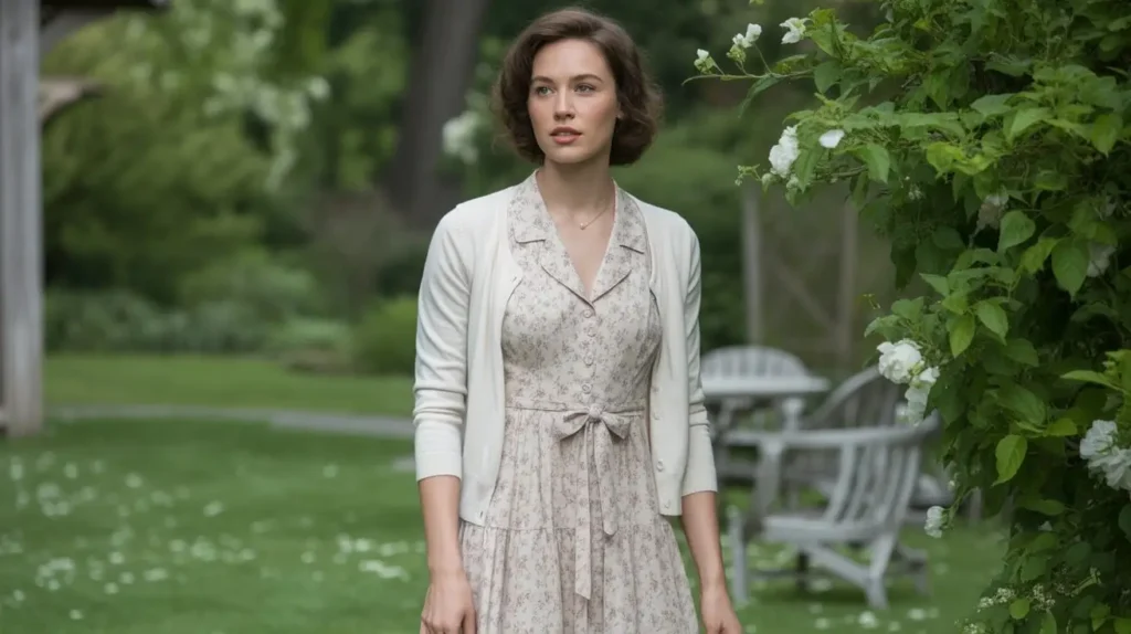 Tea dresses with delicate prints were a favorite for daytime elegance. When paired with a cardigan, the outfit becomes both feminine and practical, perfect for cooler afternoons. This combination remains an easy way to feel graceful without being too formal.