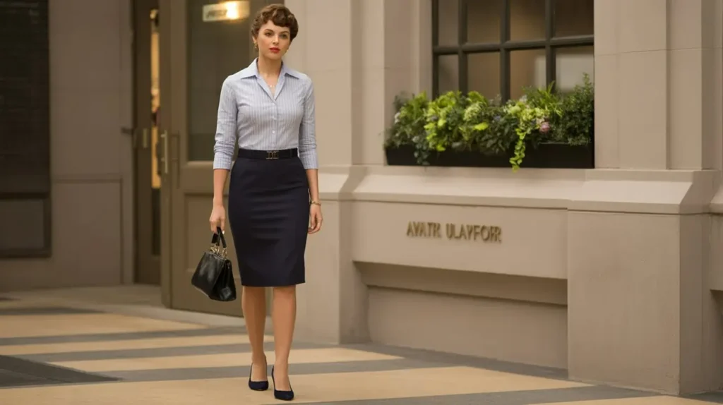 The pencil skirt paired with a crisp button-up shirt made an elegant workwear staple. Its fitted shape provided structure, while the blouse added polish. Pumps and a structured handbag complete this confident, professional look.