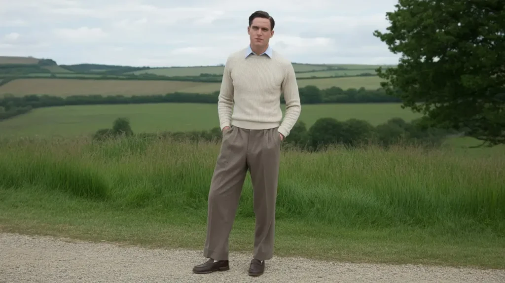 The 1930s brought a more relaxed approach to men’s style with fine-knit sweaters paired with tailored slacks. Often styled with collared shirts underneath, this outfit combined comfort with refinement. Brown leather shoes or loafers completed the polished yet casual ensemble.