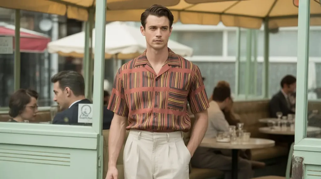 The bowling shirt was a casual favorite in the 1950s, known for its relaxed fit, camp collar, and bold prints. Paired with high-waisted trousers and loafers, it created a playful yet polished look. The shirt’s patterns ranged from stripes to embroidered designs.