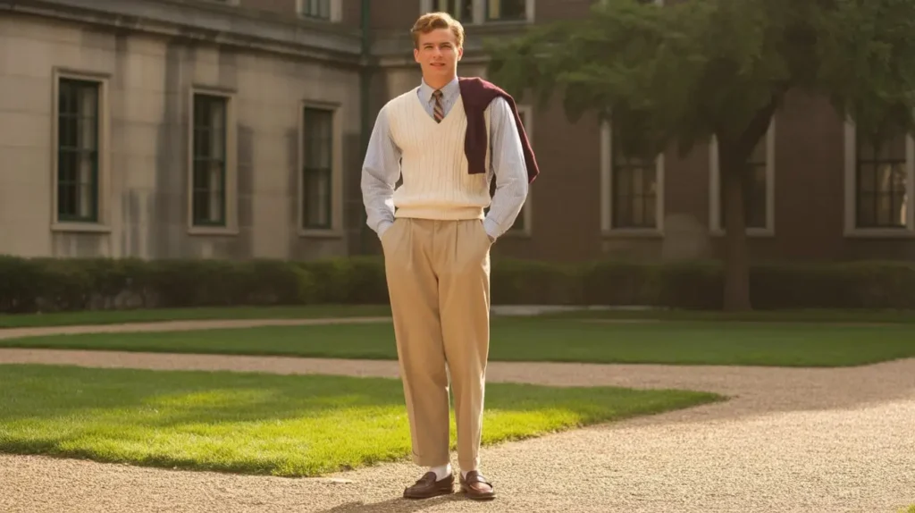 The Ivy League style of the 1950s was inspired by American college campuses, bringing clean-cut sophistication into everyday wear. This outfit often featured chinos or tailored slacks paired with button-down Oxford shirts, knit cardigans, or V-neck sweaters. Loafers or brogues completed the look, while accessories like skinny ties or crewneck sweaters over shoulders added extra charm.